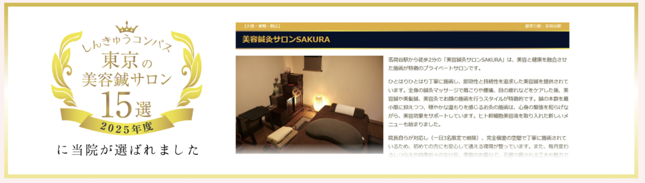 美容鍼灸の総合サイト「しんきゅうコンパス」で『東京の美容鍼サロン15選(2025)』に選ばれた茗荷谷の美容鍼灸サロンSAKURAで行われている施術です。芸能人やモデルの方も通われる美容鍼灸サロンSAKURAの瀬尾先生から直接ご指導を受け、認定をいただきました。